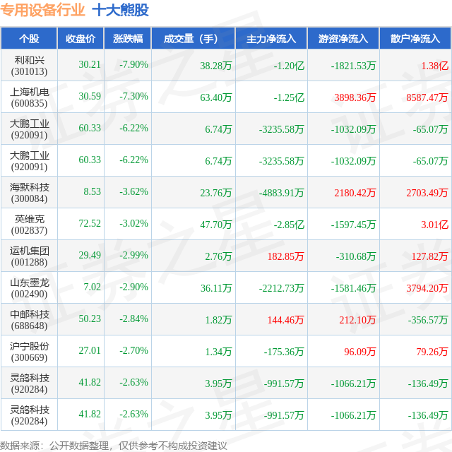 个股表现方面,专用设备行业当日领跌股为利和兴(301013),该股当日报收30.21,下跌7.9%,成交量38.28万,主力资金净流出1.2亿元。上海机电(600835)以下跌7.3%紧随其后,该股当日成交量63.4万,主力资金净流出1.25亿元。除此之外,大鹏工业(920091)、大鹏工业(920091)、海默科技(300084)均进入当日熊股之列。具体个股列表见下表: