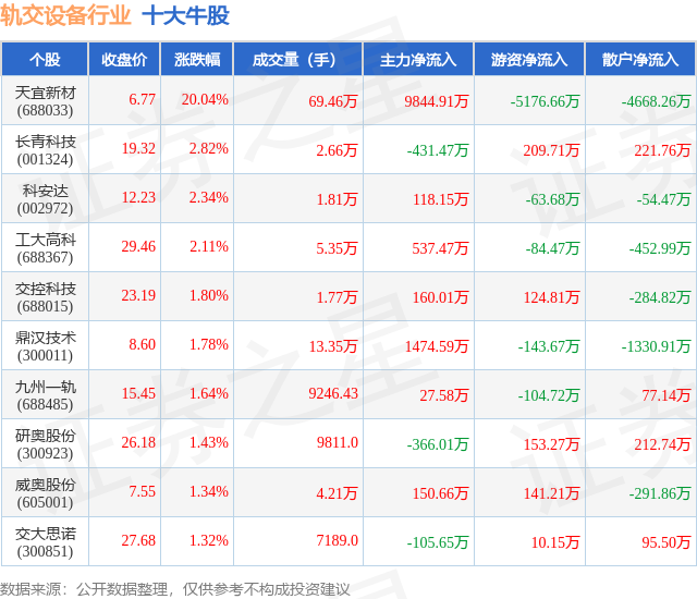 个股表现方面,轨交设备行业当日领涨股为天宜新材(688033),该股当日报收6.77,上涨20.04%,成交量69.46万,主力资金净流入9844.91万元。长青科技(001324)以上涨2.82%紧随其后,该股当日成交量2.66万,主力资金净流出431.47万元。除此之外,科安达(002972)、工大高科(688367)、交控科技(688015)均进入当日牛股之列。具体个股列表见下表: