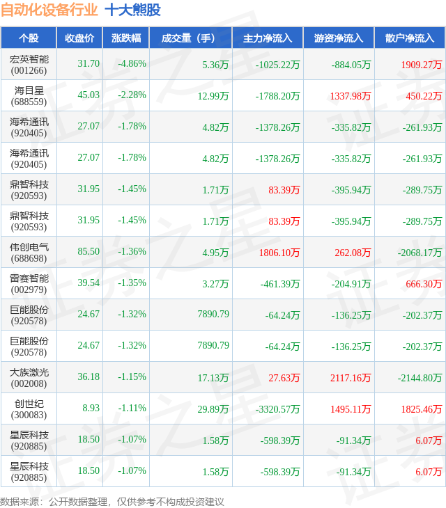 个股表现方面,自动化设备行业当日领跌股为宏英智能(001266),该股当日报收31.7,下跌4.86%,成交量5.36万,主力资金净流出1025.22万元。海目星(688559)以下跌2.28%紧随其后,该股当日成交量12.99万,主力资金净流出1788.2万元。除此之外,海希通讯(920405)、海希通讯(920405)、鼎智科技(920593)均进入当日熊股之列。具体个股列表见下表: