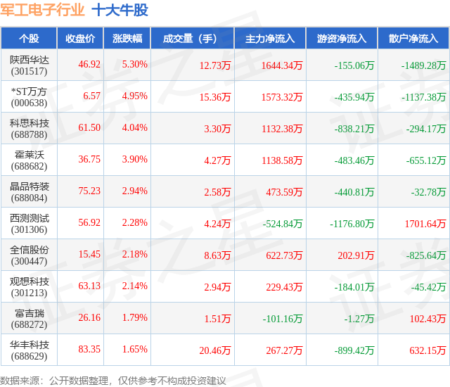 个股表现方面,军工电子行业当日领涨股为陕西华达(301517),该股当日报收46.92,上涨5.3%,成交量12.73万,主力资金净流入1644.34万元。*ST万方(000638)以上涨4.95%紧随其后,该股当日成交量15.36万,主力资金净流入1573.32万元。除此之外,科思科技(688788)、霍莱沃(688682)、晶品特装(688084)均进入当日牛股之列。具体个股列表见下表: