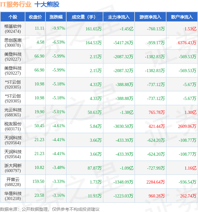 个股表现方面,IT服务行业当日领跌股为榕基软件(002474),该股当日报收11.11,下跌9.97%,成交量161.65万,主力资金净流出1.45亿元。思创医惠(300078)以下跌6.53%紧随其后,该股当日成交量164.53万,主力资金净流出5417.26万元。除此之外,美登科技(920227)、美登科技(920227)、*ST云创(920305)均进入当日熊股之列。具体个股列表见下表: