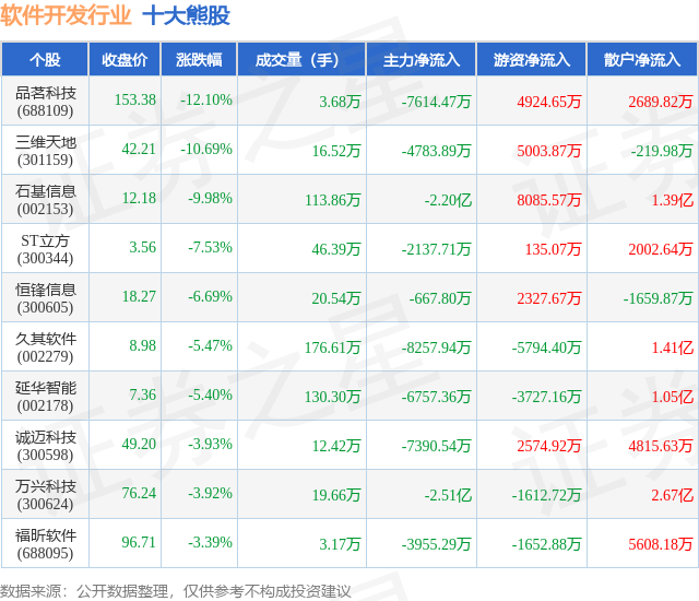 个股表现方面,软件开发行业当日领跌股为品茗科技(688109),该股当日报收153.38,下跌12.1%,成交量3.68万,主力资金净流出7614.47万元。三维天地(301159)以下跌10.69%紧随其后,该股当日成交量16.52万,主力资金净流出4783.89万元。除此之外,石基信息(002153)、ST立方(300344)、恒锋信息(300605)均进入当日熊股之列。具体个股列表见下表: