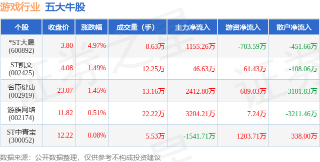个股表现方面,游戏行业当日领涨股为*ST大晟(600892),该股当日报收3.8,上涨4.97%,成交量8.63万,主力资金净流入1155.26万元。ST凯文(002425)以上涨1.49%紧随其后,该股当日成交量12.25万,主力资金净流入46.63万元。除此之外,名臣健康(002919)、游族网络(002174)、ST中青宝(300052)均进入当日牛股之列。具体个股列表见下表: