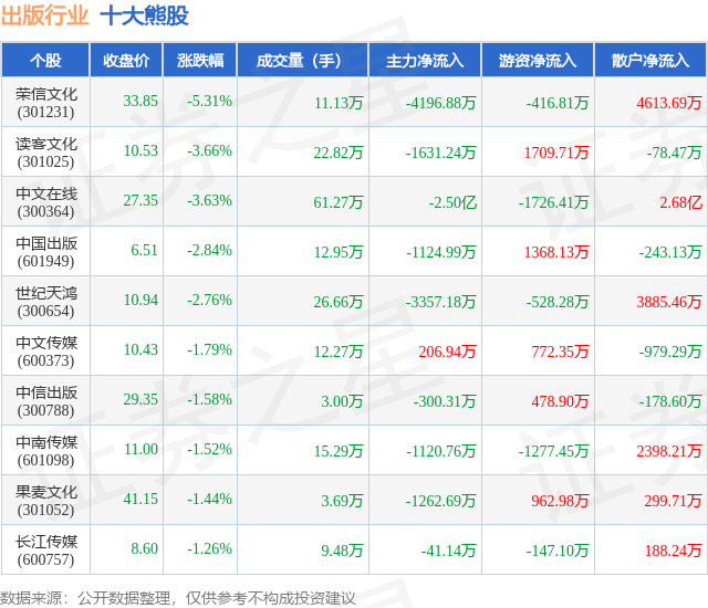 个股表现方面,出版行业当日领跌股为荣信文化(301231),该股当日报收33.85,下跌5.31%,成交量11.13万,主力资金净流出4196.88万元。读客文化(301025)以下跌3.66%紧随其后,该股当日成交量22.82万,主力资金净流出1631.24万元。除此之外,中文在线(300364)、中国出版(601949)、世纪天鸿(300654)均进入当日熊股之列。具体个股列表见下表: