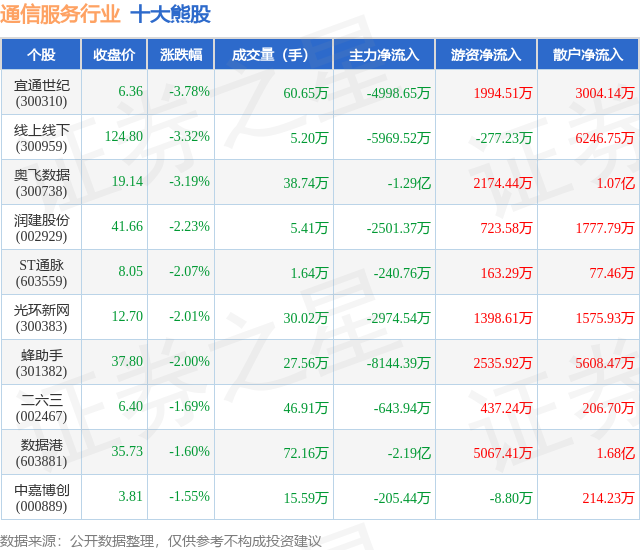 个股表现方面,通信服务行业当日领跌股为宜通世纪(300310),该股当日报收6.36,下跌3.78%,成交量60.65万,主力资金净流出4998.65万元。线上线下(300959)以下跌3.32%紧随其后,该股当日成交量5.2万,主力资金净流出5969.52万元。除此之外,奥飞数据(300738)、润建股份(002929)、ST通脉(603559)均进入当日熊股之列。具体个股列表见下表: