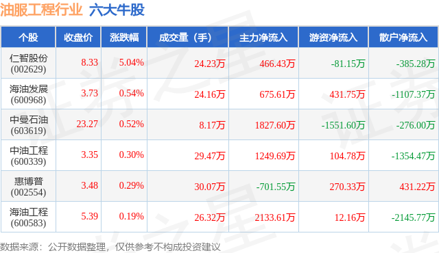 个股表现方面,油服工程行业当日领涨股为仁智股份(002629),该股当日报收8.33,上涨5.04%,成交量24.23万,主力资金净流入466.43万元。海油发展(600968)以上涨0.54%紧随其后,该股当日成交量24.16万,主力资金净流入675.61万元。除此之外,中曼石油(603619)、中油工程(600339)、惠博普(002554)均进入当日牛股之列。具体个股列表见下表: