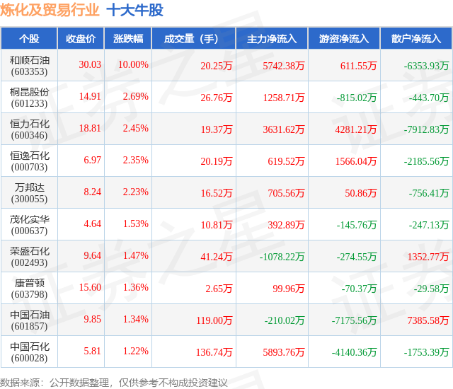 个股表现方面,炼化及贸易行业当日领涨股为和顺石油(603353),该股当日报收30.03,上涨10.0%,成交量20.25万,主力资金净流入5742.38万元。桐昆股份(601233)以上涨2.69%紧随其后,该股当日成交量26.76万,主力资金净流入1258.71万元。除此之外,恒力石化(600346)、恒逸石化(000703)、万邦达(300055)均进入当日牛股之列。具体个股列表见下表: