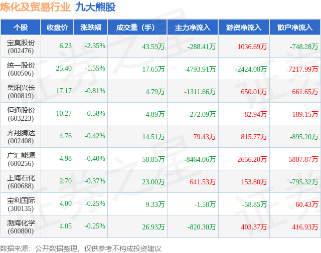 个股表现方面,炼化及贸易行业当日领跌股为宝莫股份(002476),该股当日报收6.23,下跌2.35%,成交量43.59万,主力资金净流出288.41万元。统一股份(600506)以下跌1.55%紧随其后,该股当日成交量17.65万,主力资金净流出4793.91万元。除此之外,岳阳兴长(000819)、恒通股份(603223)、齐翔腾达(002408)均进入当日熊股之列。具体个股列表见下表: