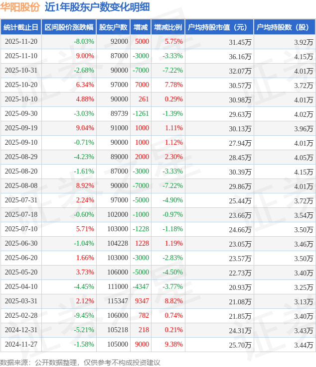 从股价来看,2025年11月10日至2025年11月20日,华阳股份区间跌幅为8.03%,在此期间股东户数增加5000.0户,增幅为5.75%。