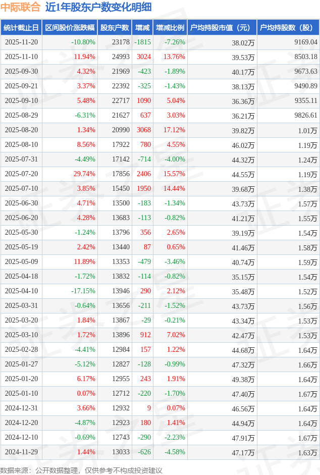证券之星消息,近日中际联合披露,截至2025年11月20日公司股东户数为2.32万户,较11月10日减少1815.0户,减幅为7.26%。户均持股数量由上期的8503.0股增加至9169.0股,户均持股市值为38.02万元。
