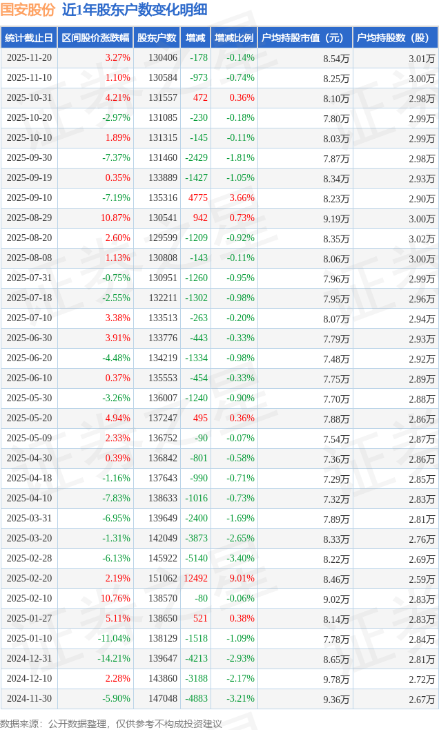 从股价来看,2025年11月10日至2025年11月20日,国安股份区间涨幅为3.27%,在此期间股东户数减少178.0户,减幅为0.14%。