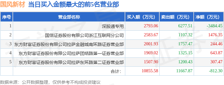 证券之星消息,沪深交易所2025年11月27日公布的交易公开信息显示,国风新材(000859)因日跌幅偏离值达到7%的前5只证券登上龙虎榜。此次是近5个交易日内第4次上榜。