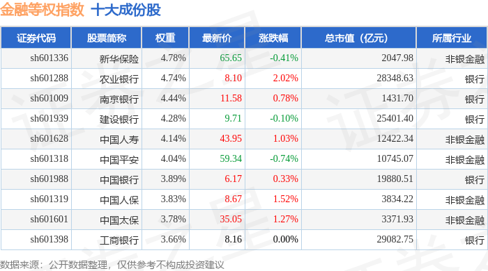 证券之星消息,11月27日,金融等权(000076)指数报收于5691.12点,涨0.48%,成交308.39亿元,换手率0.22%。当日该指数成份股中,上涨的有17家,农业银行以2.02%的涨幅领涨,下跌的有8家,中国平安以0.74%的跌幅领跌。