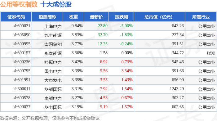 证券之星消息,11月27日,公用等权(000079)指数报收于2569.08点,涨0.14%,成交116.87亿元,换手率0.65%。当日该指数成份股中,上涨的有18家,国电电力以3.54%的涨幅领涨,下跌的有6家,上海电力以5.0%的跌幅领跌。