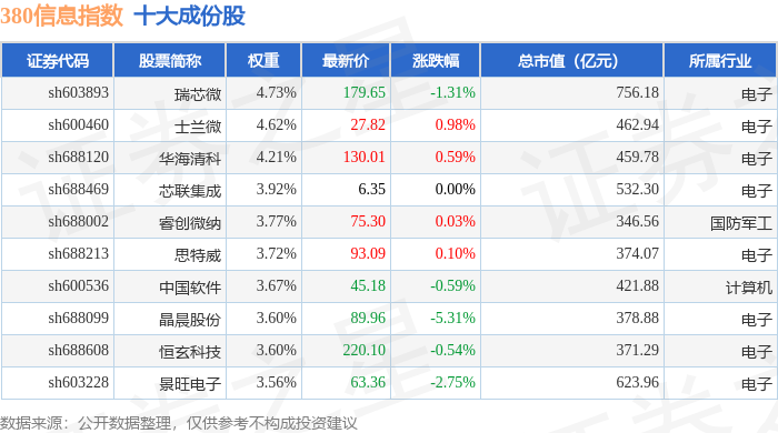 380信息(000111)指数十大成份股详情如下:
