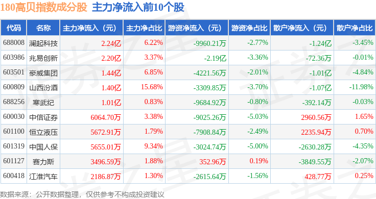 资金流向方面,180高贝(000135)指数成份股当日主力资金净流出合计11.55亿元,游资资金净流入合计5.58亿元,散户资金净流入合计5.97亿元。成份股资金流向详情见下表: