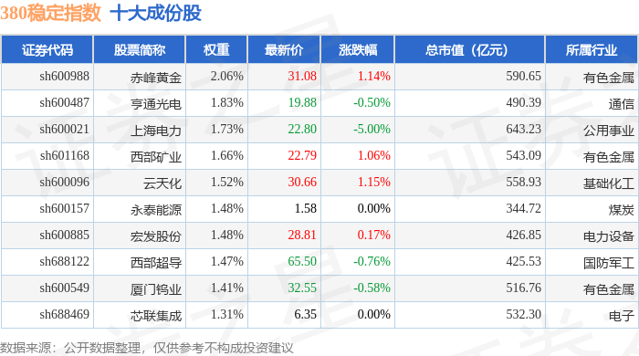 380稳定(000142)指数十大成份股详情如下: