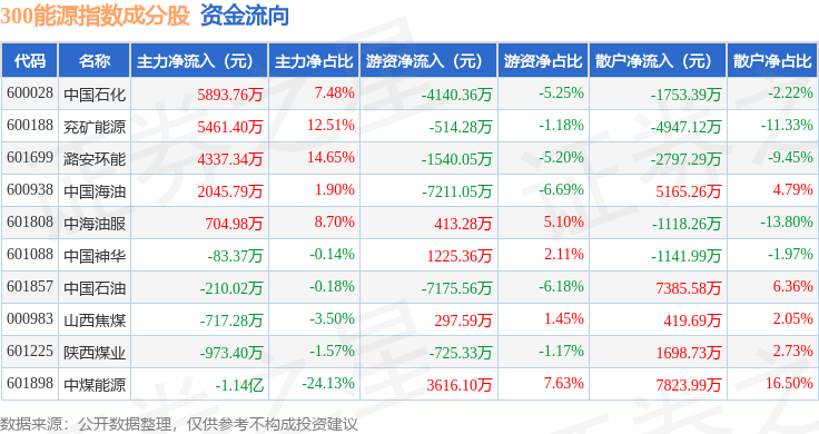 资金流向方面,300能源(000908)指数成份股当日主力资金净流入合计5019.12万元,游资资金净流出合计1.58亿元,散户资金净流入合计1.07亿元。成份股资金流向详情见下表: