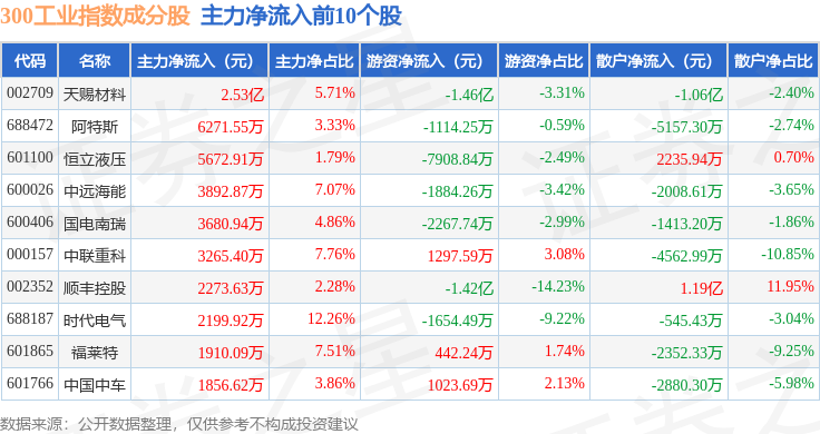 资金流向方面,300工业(000910)指数成份股当日主力资金净流出合计29.13亿元,游资资金净流入合计9.02亿元,散户资金净流入合计20.11亿元。成份股资金流向详情见下表: