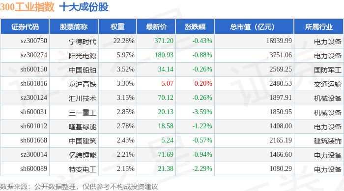 300工业(000910)指数十大成份股详情如下: