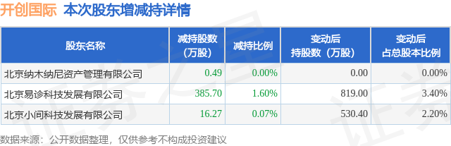 证券之星消息,11月27日开创国际发布公告《开创国际:开创国际关于持股5%以上股东权益变动触及1%刻度的提示性公告》,其股东北京纳木纳尼资产管理有限公司、北京易诊科技发展有限公司、北京小间科技发展有限公司于2025年11月18日至2025年11月27日间合计减持402.47万股,占公司目前总股本的1.6703%,变动期间该股股价下跌4.21%,截止11月27日收盘报12.73元。