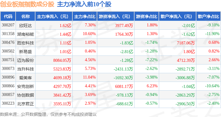 资金流向方面,创业板指(399006)指数成份股当日主力资金净流出合计53.38亿元,游资资金净流入合计19.3亿元,散户资金净流入合计34.08亿元。成份股资金流向详情见下表: