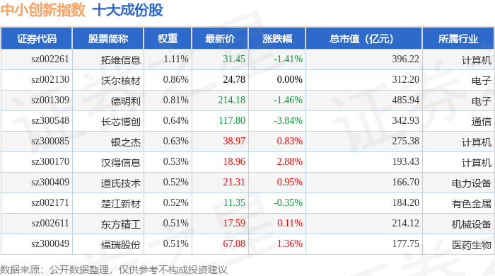 证券之星消息,11月27日,中小创新(399015)指数报收于2821.3点,跌0.11%,成交1690.18亿元,换手率2.86%。当日该指数成份股中,上涨的有228家,英唐智控以10.79%的涨幅领涨,下跌的有255家,铂科新材以8.32%的跌幅领跌。
