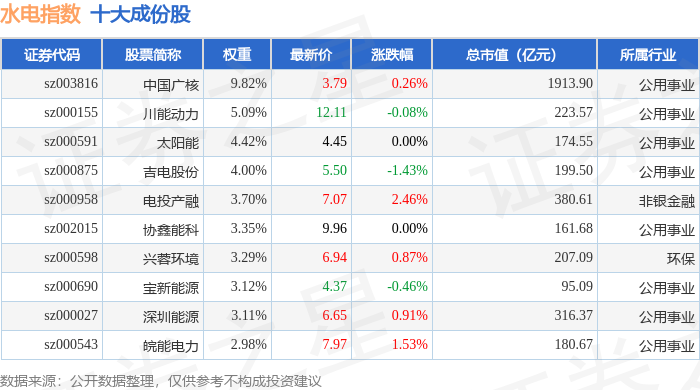 资金流向方面,水电指数(399234)成份股当日主力资金净流出合计1.07亿元,游资资金净流入合计5670.31万元,散户资金净流入合计5009.14万元。成份股资金流向详情见下表: