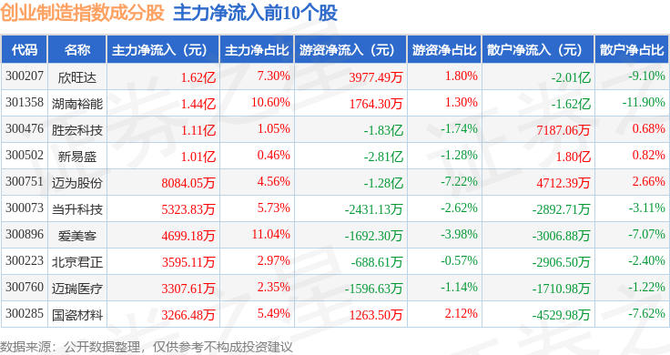资金流向方面,创业制造(399261)指数成份股当日主力资金净流出合计32.23亿元,游资资金净流入合计15.97亿元,散户资金净流入合计16.26亿元。成份股资金流向详情见下表: