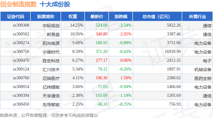 证券之星消息,11月27日,创业制造(399261)指数报收于5817.73点,跌0.38%,成交1316.31亿元,换手率2.32%。当日该指数成份股中,上涨的有19家,迈为股份以6.76%的涨幅领涨,下跌的有30家,中际旭创以3.54%的跌幅领跌。
