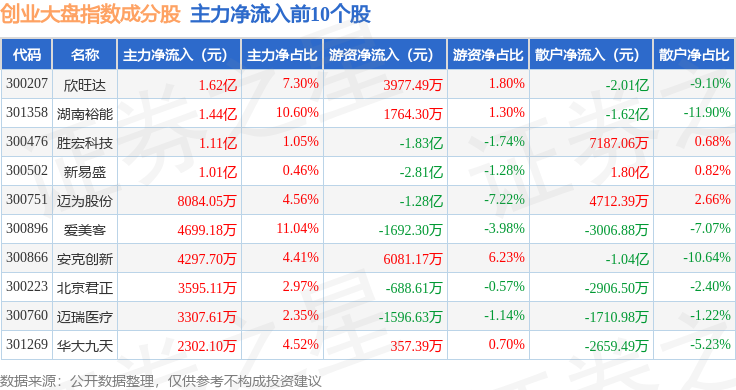 资金流向方面,创业大盘(399293)指数成份股当日主力资金净流出合计32.39亿元,游资资金净流入合计14.77亿元,散户资金净流入合计17.62亿元。成份股资金流向详情见下表: