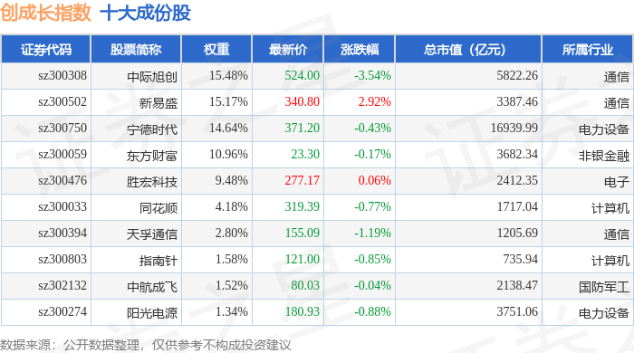 创成长(399296)指数十大成份股详情如下: