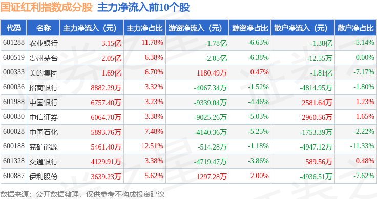 资金流向方面,国证红利(399321)指数成份股当日主力资金净流出合计9110.2万元,游资资金净流出合计1690.7万元,散户资金净流入合计1.08亿元。成份股资金流向详情见下表: