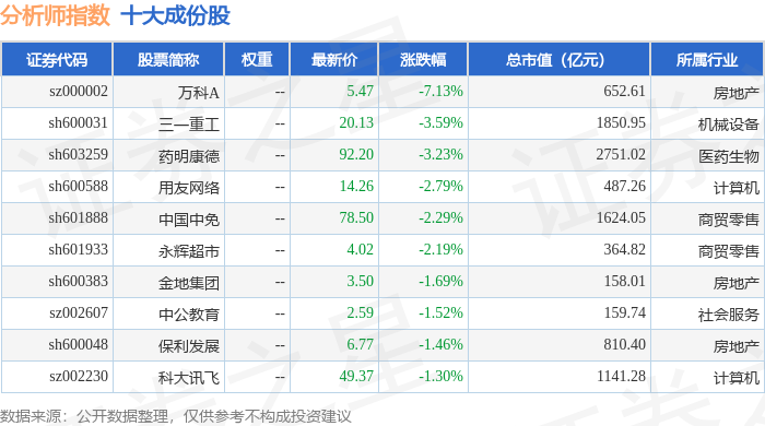 证券之星消息,11月27日,分析师指数(399354)报收于8268.99点,涨0.1%,成交2171.27亿元,换手率0.35%。当日该指数成份股中,上涨的有37家,万华化学以3.45%的涨幅领涨,下跌的有53家,万科A以7.13%的跌幅领跌。