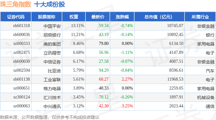 珠三角(399356)指数十大成份股详情如下: