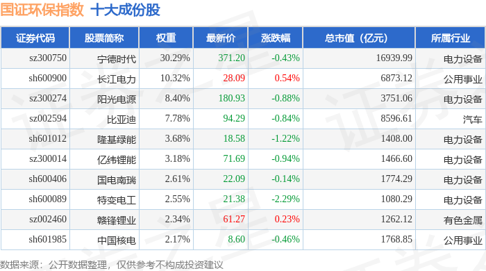 证券之星消息,11月27日,国证环保(399358)指数报收于5459.19点,跌0.3%,成交665.0亿元,换手率0.79%。当日该指数成份股中,上涨的有20家,天赐材料以2.7%的涨幅领涨,下跌的有19家,特变电工以2.29%的跌幅领跌。