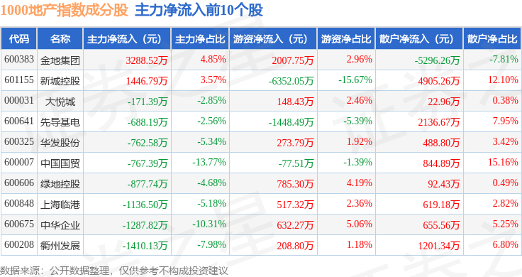 资金流向方面,1000地产(399367)指数成份股当日主力资金净流出合计5.75亿元,游资资金净流入合计1.79亿元,散户资金净流入合计3.95亿元。成份股资金流向详情见下表: