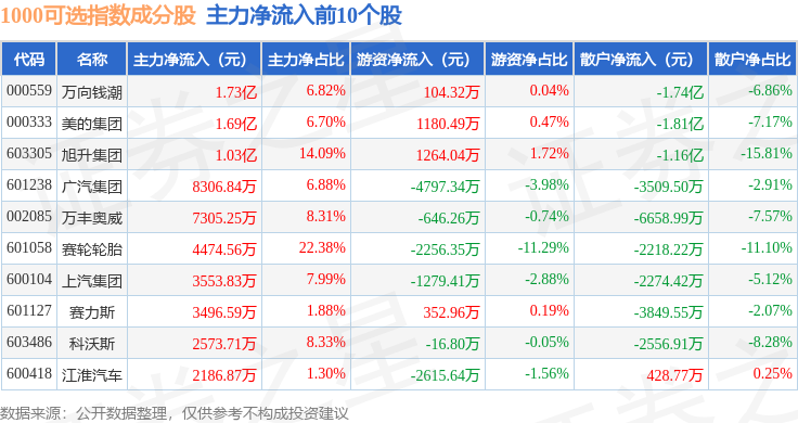 资金流向方面,1000可选(399384)指数成份股当日主力资金净流出合计22.5亿元,游资资金净流入合计5.14亿元,散户资金净流入合计17.36亿元。成份股资金流向详情见下表: