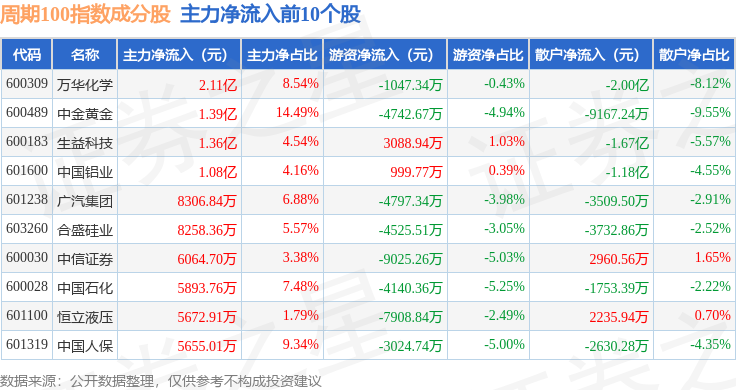 资金流向方面,周期100(399402)指数成份股当日主力资金净流出合计45.67亿元,游资资金净流入合计9.04亿元,散户资金净流入合计36.63亿元。成份股资金流向详情见下表: