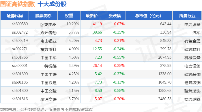 证券之星消息,11月27日,国证高铁(399419)指数报收于2066.11点,涨0.03%,成交134.32亿元,换手率0.66%。当日该指数成份股中,上涨的有21家,天宜新材以20.04%的涨幅领涨,下跌的有25家,龙溪股份以4.07%的跌幅领跌。