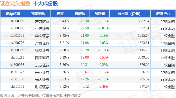 证券之星消息,11月27日,证券龙头(399437)指数报收于6575.1点,涨0.01%,成交145.72亿元,换手率0.51%。当日该指数成份股中,上涨的有10家,西部证券以1.65%的涨幅领涨,下跌的有12家,红塔证券以0.7%的跌幅领跌。