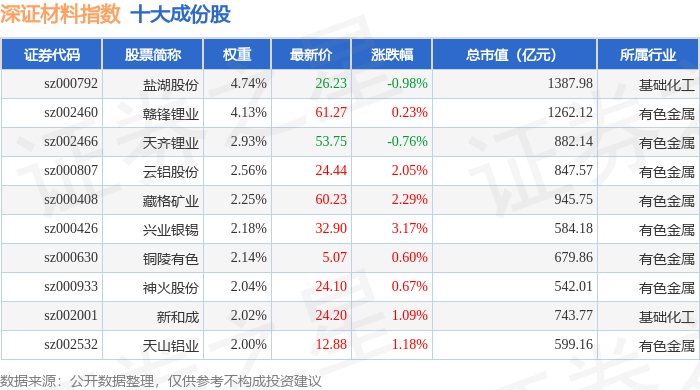 深证材料(399614)指数十大成份股详情如下: