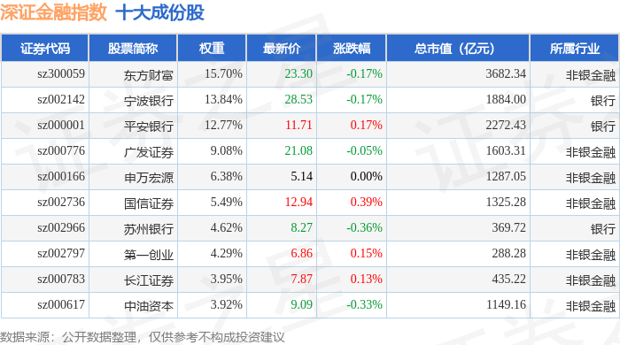 资金流向方面,深证金融(399619)指数成份股当日主力资金净流出合计2.6亿元,游资资金净流出合计640.8万元,散户资金净流入合计2.67亿元。成份股资金流向详情见下表: