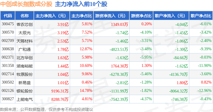 资金流向方面,中创成长(399626)指数成份股当日主力资金净流出合计57.55亿元,游资资金净流入合计8.75亿元,散户资金净流入合计48.8亿元。成份股资金流向详情见下表: