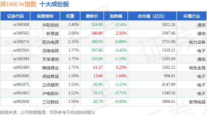 证券之星消息,11月27日,深100EW(399632)指数报收于5025.69点,跌0.44%,成交1912.96亿元,换手率0.91%。当日该指数成份股中,上涨的有36家,中兴通讯以3.25%的涨幅领涨,下跌的有60家,万科A以7.13%的跌幅领跌。