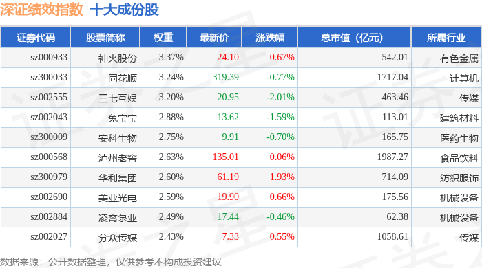 证券之星消息,11月27日,深证绩效(399655)指数报收于10653.99点,涨0.1%,成交683.23亿元,换手率1.18%。当日该指数成份股中,上涨的有49家,科思股份以9.12%的涨幅领涨,下跌的有45家,沪电股份以3.71%的跌幅领跌。