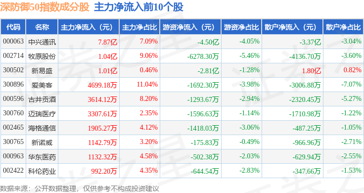 资金流向方面,深防御50(399671)指数成份股当日主力资金净流出合计19.95亿元,游资资金净流入合计9.32亿元,散户资金净流入合计10.62亿元。成份股资金流向详情见下表: