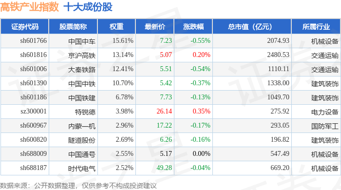 资金流向方面,高铁产业(399807)指数成份股当日主力资金净流出合计7720.44万元,游资资金净流出合计3528.6万元,散户资金净流入合计1.12亿元。成份股资金流向详情见下表: