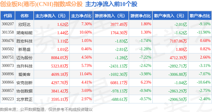资金流向方面,创业板R(港币)(CNH)(470006)指数成份股当日主力资金净流出合计53.38亿元,游资资金净流入合计19.3亿元,散户资金净流入合计34.08亿元。成份股资金流向详情见下表: