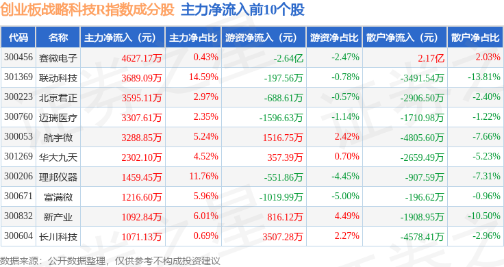 资金流向方面,创业板战略科技R(471004)指数成份股当日主力资金净流出合计4.53亿元,游资资金净流出合计6217.63万元,散户资金净流入合计5.15亿元。成份股资金流向详情见下表: